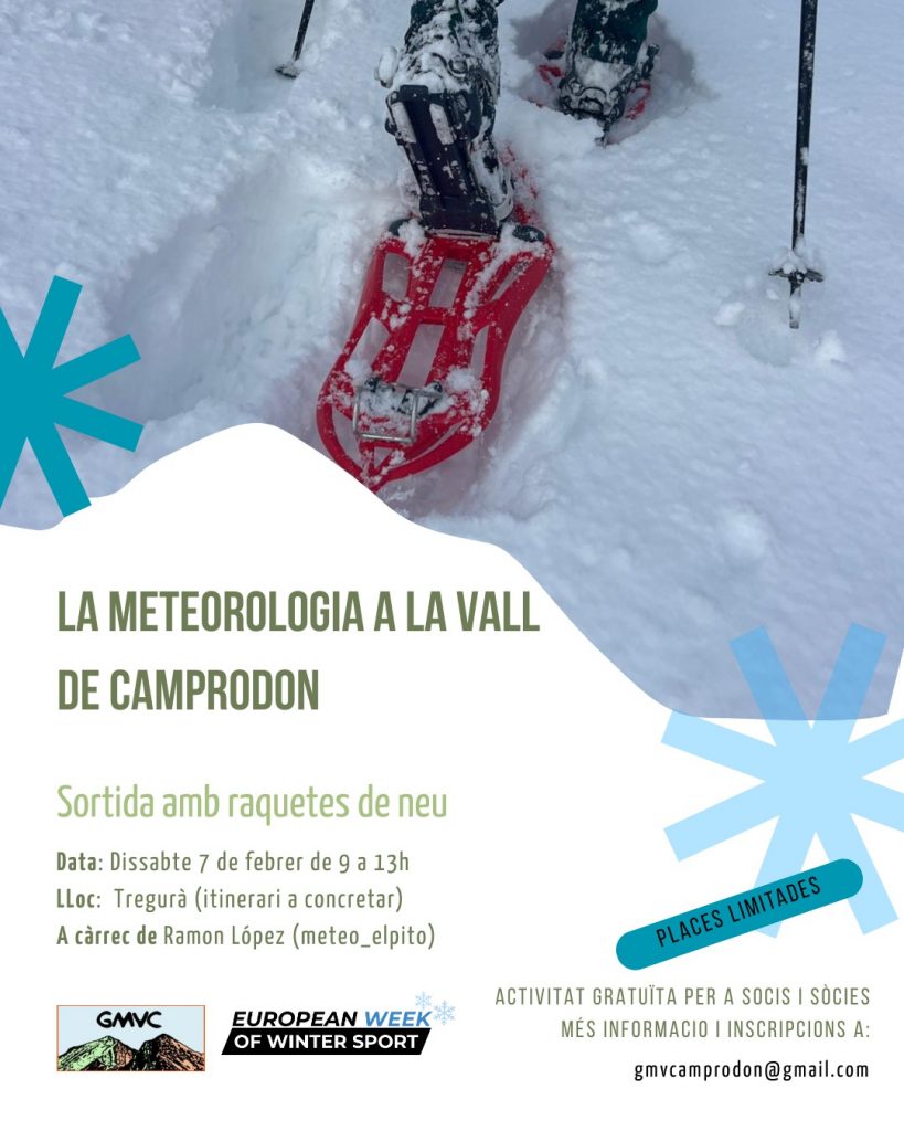 Sortida amb raquetes de neu per descobrir com funciona el temps a la muntanya durant l’hivern. Parlarem de la meteorologia pròpia de la Vall de Camprodon i com ha anat canviant al llarg dels anys, de com es formen els episodis de neu, fred, vent o canvis bruscos de temps, i de com aquests fenòmens influeixen en el paisatge i les condicions que ens trobem quan anem a fer activitat a la muntanya.
